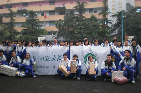 2009年4月3日,学校组织了一部分同学去彭州灾区参加手拉手活动。 一位学生在日记中写道:这不仅仅是一次简单的出行,更是一次去触碰灾区同胞伟大而坚强的心灵的旅程。我们首先去了小鱼洞大桥。看到的,是一片忙碌的重建景象,但那桥的完全垮塌的“W”形还是让人感到震惊。随即我们去了一所临时修建的板房小学去吃饭。在那里,我们看到了两位中午在学校吃饭的小学生,因为学校没有食堂,他们只能教室里吃小盒的泡面;还遇到了四位灾区的小朋友,他们年龄很小,虽然家园遭受了巨大的灾难,但他们依旧是那么的开朗,性情还是那么的活泼,在石子路上玩耍嬉戏,脸上充满了阳光的笑容。下午,我们去参观了5.12中最牛的学校——白鹿中学。那座教学楼被地震抬高了三米,依然屹立。让我非常有感触的,是那些承受着巨大悲痛的灾区同胞们,在大灾过后如这教学楼般,依然开朗的迎接来年的春天,这是何等的坚强与伟大。最后我们来到了手拉手的学校——彭州市磁峰中学。我们深情的表演了手语歌“最好的未来”。向该学校的同学赠送了许多的礼物,书籍等。从与我手拉手的那位同学口中得知,他们在灾后的一个月中,每天都要上下学步行两个小时到达临时教学点。现在在这个学校也是要和同门一起包车,每天一两个小时的车程才能到达学校。当我走进他们的教室,翻开他们的课本,和我们初三的课本一样,里面都做满了笔记,黑板上还留着老师讲的一道几何题,我甚至可以想象出他们是如何怀着一颗回报社会的心认真的学习的。那琅琅的读书声与专注的目光,似乎又在我耳边在我眼前展现。他们的精神,在我脑海中,久久不能退去…… |