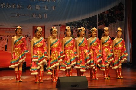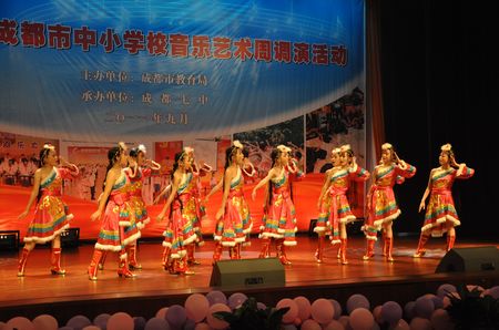 【艺术教育办公室  讯】2011年9月26日,由我校初2013级14位女生(二班:罗舒、谢雨蓓、刘晗璐、张菊、陈馨玥  五班:沈梦瑶、段婷婷    七班:陈可依、龙香钰、李诗梦、牛培鑫    八班:钟欣怡、罗懿紫、魏小云)组成的校表演唱队参加成都市教育局举办的“2011年成都市中小学校音乐艺术周表演唱”比赛,以一曲《采花》荣获第三名。