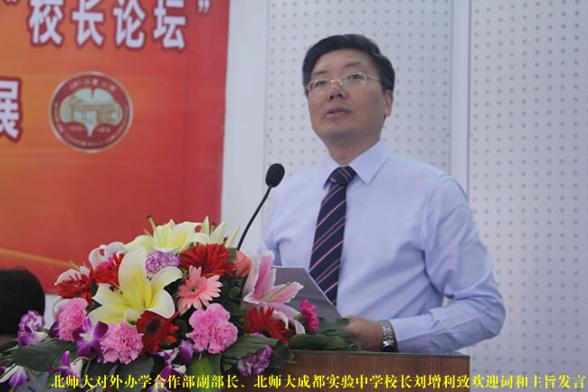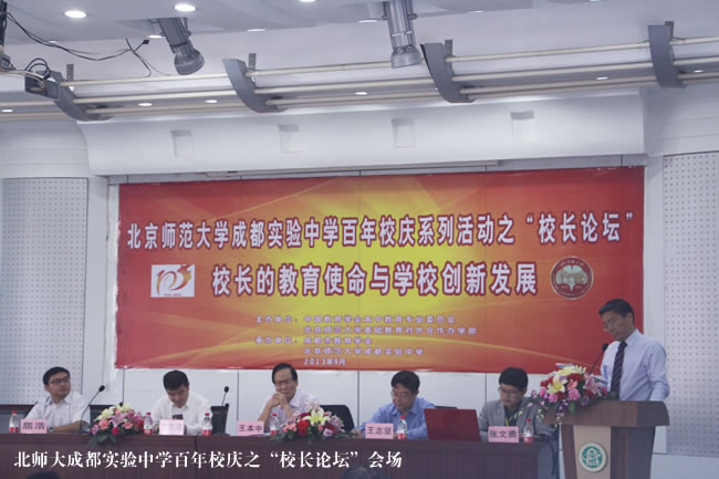 在2013年9月26日北京师范大学成都实验中学举行四川省立第一中学——省立成都中学——成都二中——北京师范大学成都实验中学百年庆典之际,为了与各兄弟学校的同行共同分享百年老校的荣光,共叙我们的教育梦想,担当时代赋予我们的教育使命。9月25日,在我校举行了“校长的教育使命与学校创新发展”的校长论坛。一起与兄弟学校探究“教育的高度”、研讨“教育的厚度”、 拿捏“教育的力度” 、设计“教育的温度”,期望能在历史与现实之间为学校发展寻求新的突破,为中国教育改革与发展做出贡献。