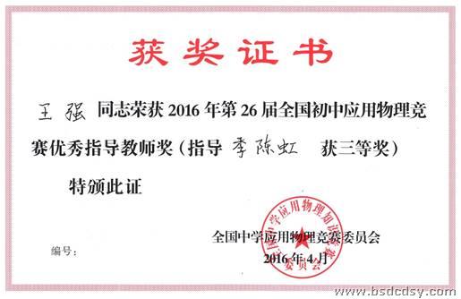 20164月,我校组织初二、初三学生参加了26届全国初中应用物理竞赛,经过校内初赛选拔,我校初中部95位同学代表学校参加了在树德实验考点的复赛,参加复赛的同学们充分发挥了自己学习上的优势,完美展示了弘毅学子的学习成果,取得了可喜的成绩。(初三年级的36位同学取得了全国三等奖1个、省一等奖6个、省二等奖11个、省三等奖18个;初二年级的59位同学取得了省一等奖4个、省二等奖9个、省三等奖46个)物理组王强、王光辉、凌锡帮、唐国淋、蒋都红、梁翠梅、张彬等获得优秀指导教师奖、受得了竞赛组委会的表彰。