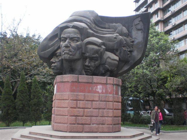 成都市第二中学校校门 梁伯言题写 周兴释提供 从左至右谯宇筠 贾廷瑞 周兴释 流沙河 邵仲节 费大勇 学生 吴燕