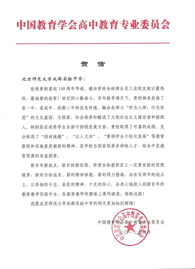 中国教育学会高中教育专业委员会贺信: