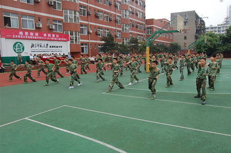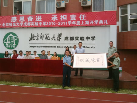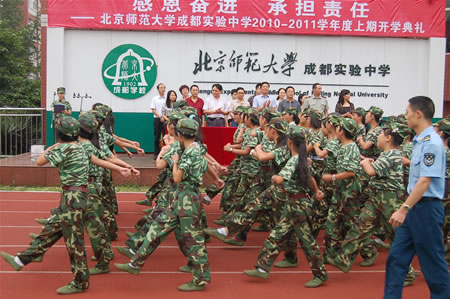 【学生记者团  高2012级5班  洪若涵  】2010年9月1日,北师大成都实验中学2010~2011学年度开学典礼在庄严的国歌声中拉开序幕。全体北师大成都实验人、家长代表以及负责2013级新生军训的成都市国防教育基地的官兵出席了本次典礼。