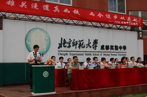 2006年9月1日上午,全校师生集会举行了主题为“雄关漫道真如铁,而今迈步从头越”的2006—2007学年度开学典礼。首先刘增利校长介绍了主席台就座的来宾、中层以上干部和特级教师,并发表新学年致辞,在致辞中刘校长回顾了学校改制四年来全校师生所付出的艰辛和取得的成就,并明确表态:“我们将不辱使命努力实现‘办好一所学校,服务一个地区’的目标!”刘校长对“如何进一步提高高中教学质量”进行了解读,并倡导全校师生进一步推动“学校‘和谐’文化的建设,用我们的言行来涵养学校的和谐文化”,以激励全校师生继续努力工作和学习,同时也对工作和学习提出了严格的要求并寄予殷切的希望,“不能满足于昨日的成绩,要面向明天,抓住今天”。开学典礼上,我校还举行了法制副校长聘任仪式,书院街派出所副所长魏柯和交警五分局一大队警长李勇分别被聘为我校法制副校长,刘校长为他们颁发了聘书。最后,高、初09级新生进行了军训成果汇报表演,八个军训方队进行了整齐庄严的队列展示,学生们精神抖擞,英姿飒爽;军体拳、徒手操、倒功等技能展示,每一项汇报表演都精彩纷呈,展现了新时期青少年的青春与活力。全体师生和家长代表对本次军训成果都给予了充分的肯定。