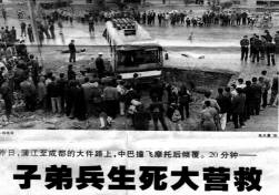 首先,利用实物投影仪直接投影出报纸上的新闻图片(如右图所示),并利用多媒体同时播出事先制作的声音文件:10月27日上午,在蒲江寿安镇插旗村3组机耕道与大件路连接处,一辆牌照为川A33711的客运中巴载着15名乘客正高速从蒲江往成都方向行驶,突然,公路右边的机耕道上冲出了一辆摩托车,在躲避不及的情况下,中巴车撞飞摩托车,最后翻倒在公路外的水沟旁,并导致摩托车驾驶员当场死亡,中巴车上两名乘客在车祸中丧生,十多名乘客受伤。读完新闻,设问:如果你是一名交警,根据中巴的刹车情况能否判断中巴车在大件路上的行驶是否违规?至此,学生思想活跃,为后面的教学奠定了基础。