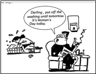 The picture shows that a wife is washing clothes and the husband is sitting in an armchair reading newspapers, smoking and saying: “Oh, darling, put off the washing until tomorrow. It’s Women’s Day today.”