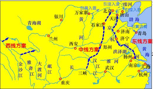 南水北调规划东线、中线和西线三条调水线路,分期实施。 (1)东线工程:利用江苏省已有的江水北调工程,逐步扩大调水规模并处长输水线路。规划分三期实施。 (2)中线工程:从加坝扩容后的丹江口水库陶岔渠首闸引水,沿规划线路开挖渠道输水,沿唐白河流域西侧长江流域与淮河流域的分水岭方城垭口,经黄淮海平原西部边缘在郑州以西孤柏嘴处穿过黄河,继续沿京广铁路西侧北上,可基本自流到北京、天津。规划分两期实施。 (3)西线工程:在长江上游通天河、支流雅砻江和大渡河上游筑坝建库,开凿穿过长江与黄河的分水岭巴颜喀拉山的输水隧洞,调长江水入黄河上游。