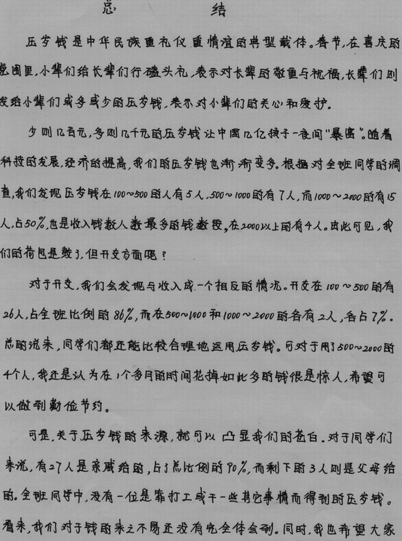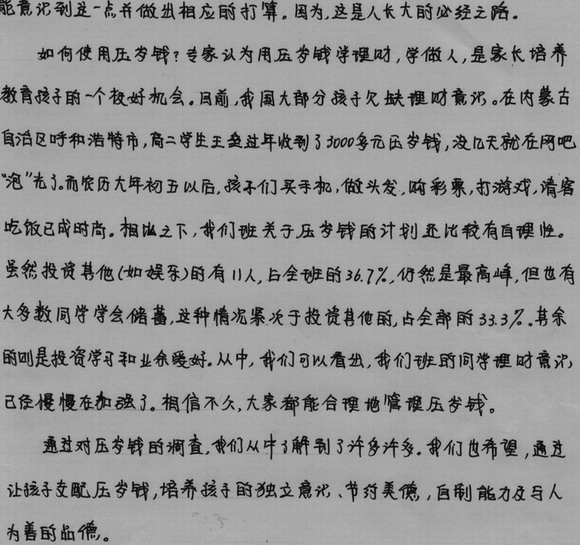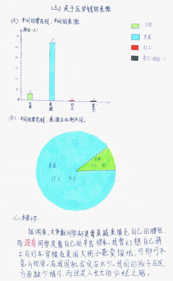 今天,我做了一次“家庭主妇”:买菜、算账。 以前在许多书中看过父母辛苦做家务的描述,原来心里还觉得有点夸大其词,直到今天,我才发现那并不夸张。又要考虑全家的总饭量,又要考虑现有的钱……终于知道了父母的辛苦,也觉得错怪了父母回家就倒在沙发上。我决定要好好为父母捶捶肩、洗洗脚。当父母听到我要给他们捶肩时,高兴得合不拢嘴,父母就是这样容易满足。其实他们想要的并不多,我不禁一阵心酸。我应该能带给父母更多!