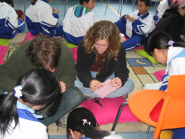 在美术教室里,剪纸、十字锈等手工制作吸引了不少美国朋友,我校学生手把手地教他们制作这些手工作品,并将完成的作品作为礼物赠送给美国学生。