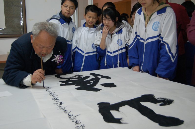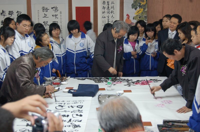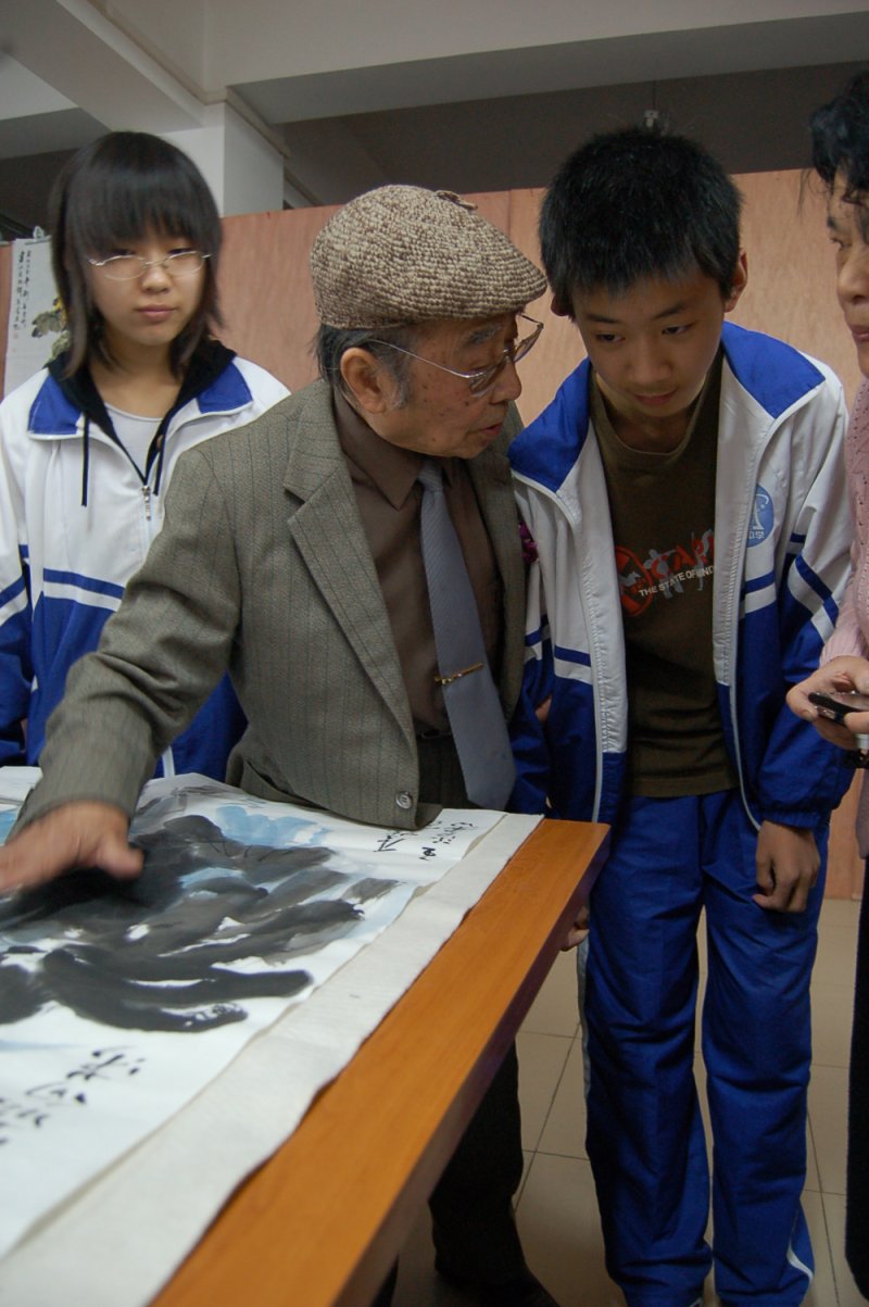 在现场笔会活动中,学校书画社的部分学生和老校友们同台展示技艺,老校友们对小同学的作品一一进行了点评指导,会后学生们都表示“大师的指导让他们获益匪浅”。我国一级美术师、中国美术家协会会员、中国诗书画研究院院士张幼矩校友也兴致盎然,即兴作诗“只要自己多努力,读书何须四七九”来勉励学生。