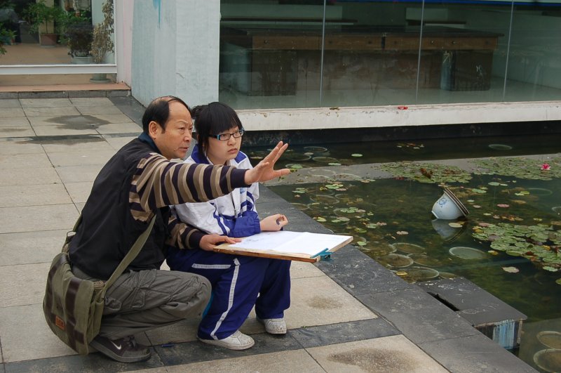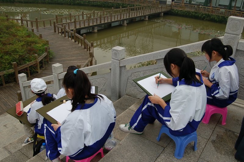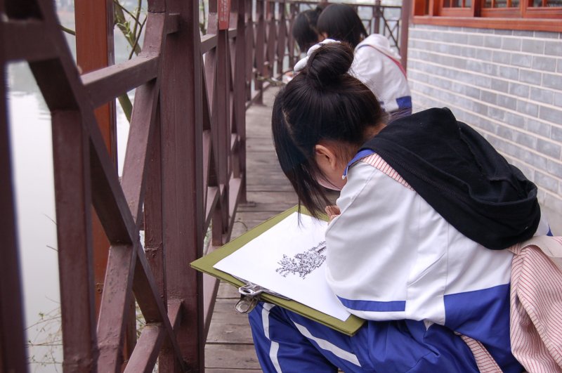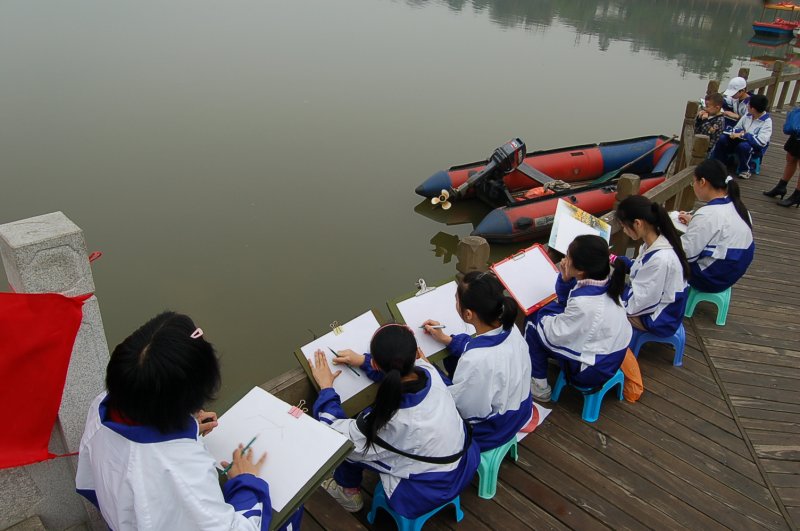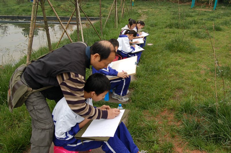 早晨8点整,满载着同学们的交通车从学校出发,首先来到了“五朵金花”中的幸福村,随车的当地导游带领大家乘车游历了幸福梅林、江家菜地、东篱菊园、荷塘月色以及花乡农居五个景区,还结合自己十多年来在三圣乡生活的亲身体会向同学们描述了改革开放给农村带来的方方面面的变化,同学们都深有感触。在随后的实地写生作画过程中,同学们把这种亲眼所见的新农村景象,通过自己手中的画笔,展现在了一幅幅画卷中。