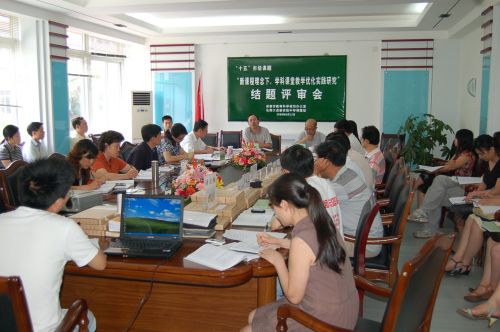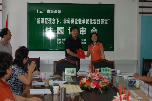 6月12日,我校进行了“十五”市级课题的现场结题鉴定并顺利结题。此次结题由成都市教育科学规划办公室组织,规划办邀请了四川师范大学教科院副院长、硕士生导师、刘先强教授,四川省社科院知名教育专家查有梁教授,成都市教育专家、特级教师卿平海老师,市教科所理论室主任胡燕女士、市教科所理论室副主任顾颉先生、市规划办公室副主任刘旭先生作为评审组成员。上午8:55—9:35与会专家分别听了两节课题汇报课:语文是由阙颖老师执教的《念奴娇 赤壁怀古》;数学是由李阳老师执教的《勾股定理探索》。两节课都得到了专家的高度评价。9:40—10:00专家们还参观了我校的课间操。他们为我校的学生素质以及学生管理的高效折服。10:00以后的会议由专家组组长刘教授主持,首先听取了课题组组长刘增利校长的课题研究报告,其后评审组成员分别对课题研究的情况进行了评述,同时还就相关问题向主研人员进行了询问并听取了回答。最后评审组对课题研究情况进行合议并由评审组长刘教授宣布评审结果。在评审结论中,专家们写道: