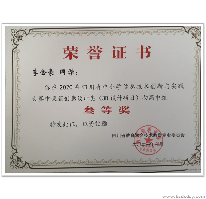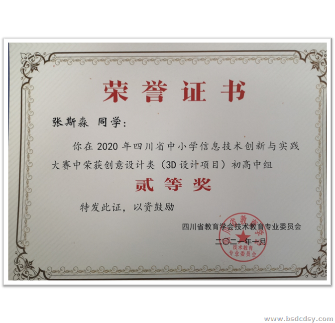 在2020年四川省中小学信息技术创新与实践大赛中,我校杨杰老师指导的学生张斯淼、李金豪两位同学分别获得创意设计类(3D设计项目)初高中组二等奖和三等奖。特向两位同学和指导老师表示祝贺。