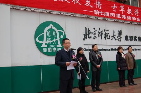 【学生处 讯】我校于2011年3月2日星期三下午班会课时间在操场举行了“恩泽深深校友情,寸草报得三春晖”第七届恩泽奖学金颁奖仪式。恩泽奖学金管理代表、四川大学化工学院院长梁斌教授、北京师范大学成都实验中学刘增利校长、杨延凤书记、张继东副校长、魏月香副校长、校长助理张文勇老师出席此次仪式。 刘校长在讲话中回顾了学校一年来的发展,他希望学生们能够勤奋学习,注重方法,提高学习效率,抓住点滴时间击破各个零碎的知识点,学习闵老的精神,追逐成功的梦想。之后梁斌教授为我们带来了闵恩泽爷爷的殷切期望:“我身体很好,还在努力工作。希望同学们身体健康,好好学习。我等着你们的好消息。”同学们仿佛感受到闵爷爷又一次来到了我们的身边,期盼着我们能够成为未来社会精英,肩负社会责任,不断创造辉煌。之后魏月香副校长宣布了第七届恩泽奖学金获奖名单,梁斌教授为获奖学生颁发了奖金和证书。获奖学生代表初2011级2班杜晴同学发表获奖感言,她代表全体学生向闵爷爷表达了祝福,并表示将在闵爷爷的鼓励下发奋学习,在这个崭新的全面变革的时代,满怀激情,敢于拼搏,不断跨越,在信仰的战场上,保持生命冲锋的姿态!最后奖学金管理代表梁斌教授与全体获奖学生合影留念。北京师范大学成都实验中学第七届恩泽奖学金颁奖仪式在热烈的掌声中圆满结束。 |