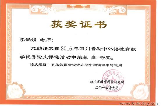 在四川省教育科学研究所组织的2016年四川省初中外语教育教学优秀论文评选中,我校李涵娟老师在多年的基于核心问题的学思课堂研究与实践中撰写的论文--《有效的课堂设计在初中阅读课中的运用》,论文中她以核心问题为主线,围绕学生的学和思进行了巧妙的课堂设计,有效的提高了阅读课堂教学的质量,她用较多的可操作的案例和详实的案例分析,介绍了有效的课堂设计在初中阅读课中的运用。李涵娟老师的这篇论文荣获了本次论文评选的一等奖。
