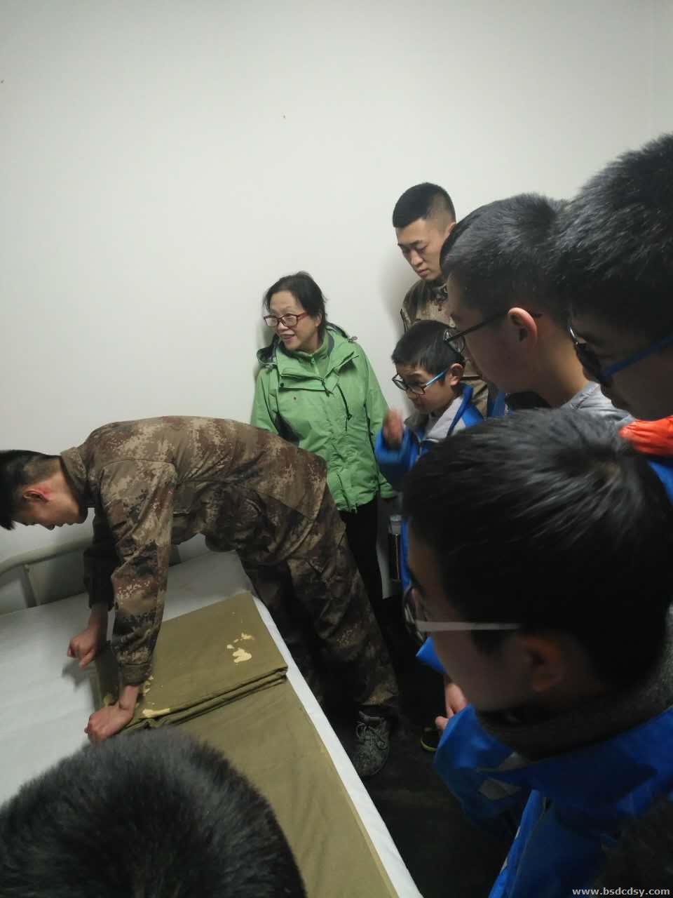 随后,部队官兵带领同学们到宿舍观摩学习。楼道水泥地拖得发亮,小到牙刷、杯子、皮带、拖鞋,到大衣、床单,被子,叠放得整整齐齐,床单象一张崭新的白纸,衣柜里衣服整理有序,鞋子象仪仗队一样整齐,被子上的军帽及旁边的皮带摆放位置整齐划一,整个宿没有一丝凌乱。当同学们看到了期待已久的“豆腐块”时,眼睛都瞪得大大的受到了震撼!