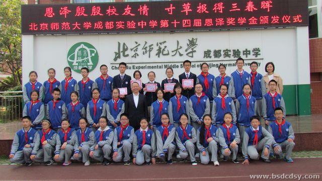 大家好!今天又到恩泽奖学金的颁奖时刻了,今年是第14届恩泽奖学金颁奖,我同北师大成都实验中学的同学们、老师们一样,非常高兴,这是一个值得祝贺的日子。我每年都参加颁奖典礼,我已经成为北师大成都实验中学的一员,非常兴奋、也非常幸福。我们在一起,盘点过去一年我们取得的成绩,祝愿来年的进步。在恩泽奖学金设立的14年中,北师大成都实验中学取得了长足的发展,连续10年获得成都市教育局表彰,去年学校高三毕业生有三分之一被211、985高校录取,一批又一批的同学获得恩泽奖学金,我为学校的发展感到高兴,也为我们这些同学取得好成绩感到骄傲。