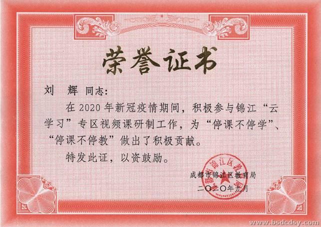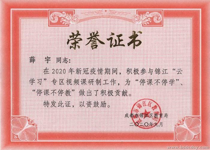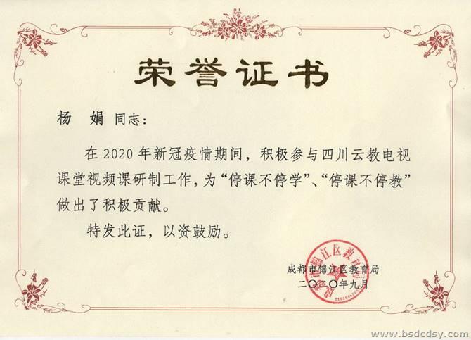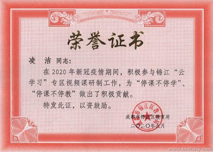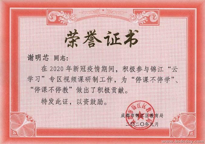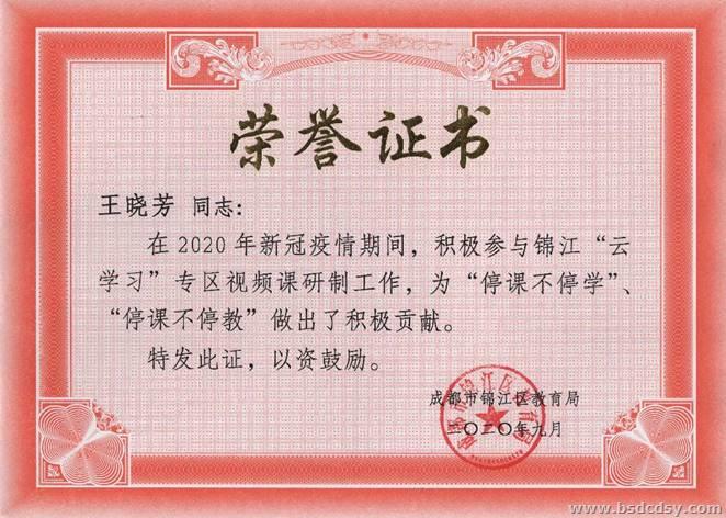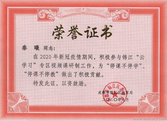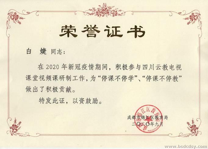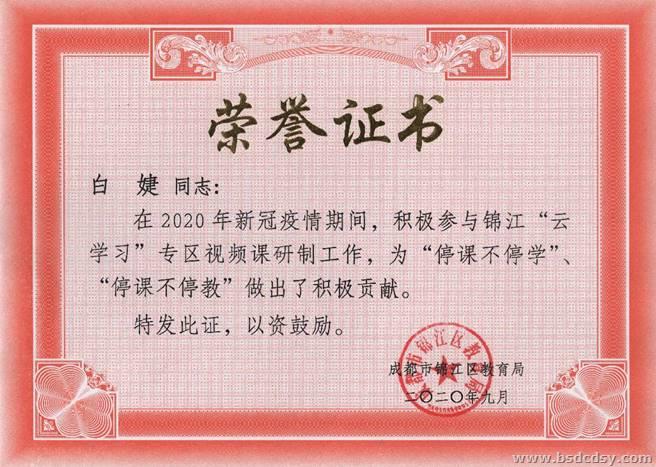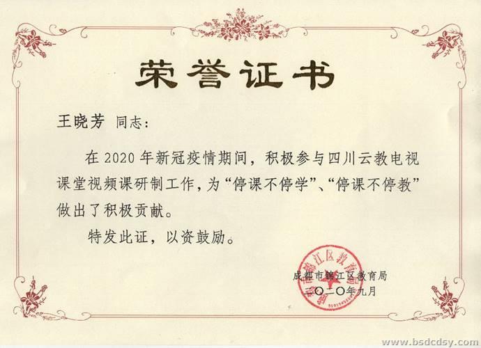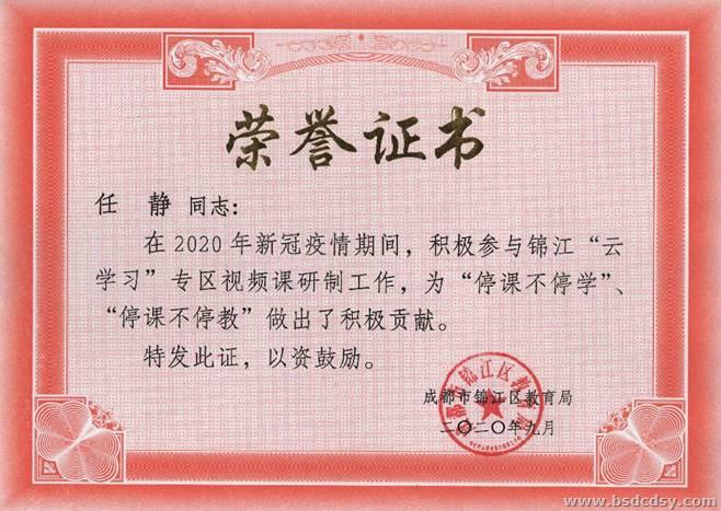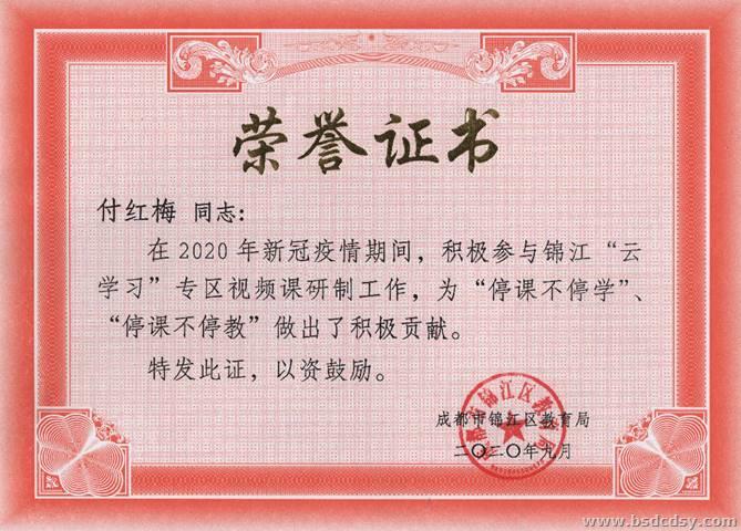 2020年新冠疫情期间,我校杨娟、白婕、王晓芳三位老师受邀参与了四川省云教电视课堂视频课研制,付红梅、薛宇、秦曦、凌洁、任静、李涵娟、白婕、刘辉、谢明芯、王晓芳等十位老师受邀参与了锦江区“云学习”专区视频课研制,他们制作的视频课例受到学生好评,为四川省和锦江区“停课不停学”、“停课不停教”做出了积极地贡献。为了表彰他们在同心战疫中所作出的工作,锦江区教育局特为上述十一位老师颁发了荣誉证书,以资鼓励。