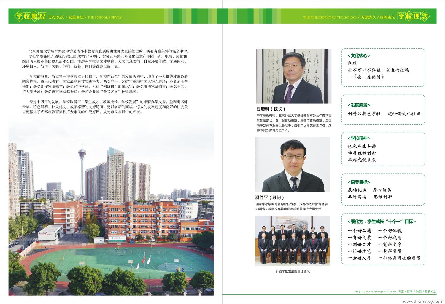 北京师范大学成都实验中学(简称:北师大实验)是成都市教育局直管一所有寄宿条件的完全中学。学校座落在风光漪旎的锦江猛追湾的怀抱中,占地面积24亩。目前在校学生共41个班,近2000人。