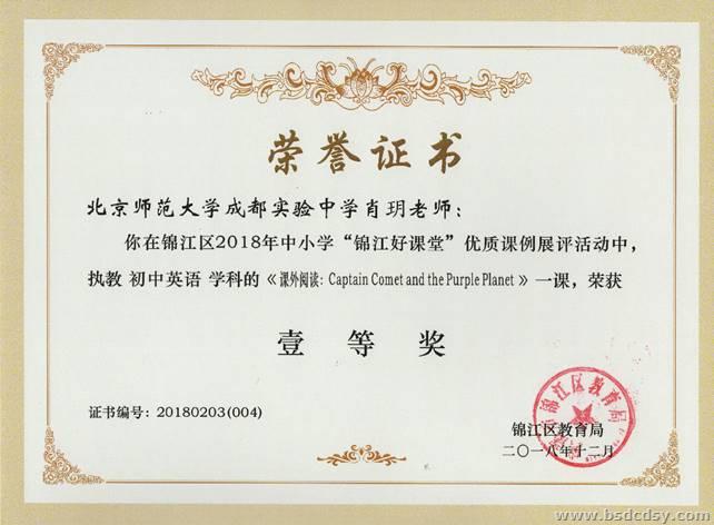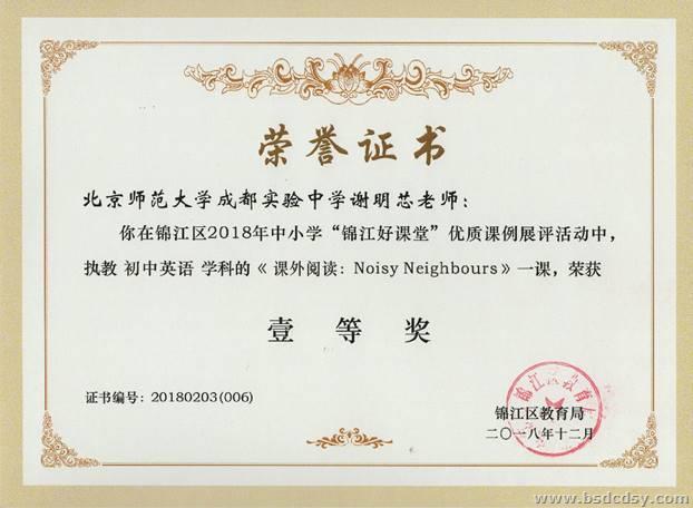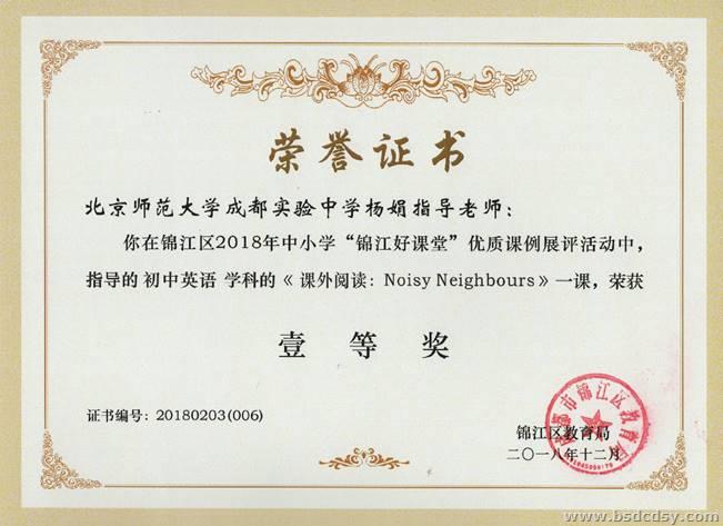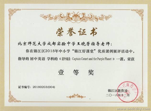 在锦江区2018年中小学“锦江好课堂”优质课例展评活动中,我校杨娟老师指导谢明芯老师执教的初中英语学科的《课外阅读:Noisy  Neighbours》和王晓芳老师指导肖玥老师执教的初中英语学科的《课外阅读:Captain Comet and Purple Planet》均获得了一等奖,兰洁老师指导赵师龙老师执教的初中英语学科的《课外阅读:Captain Comet and Purple Planet》获得了二等奖。特向全校师生报喜。