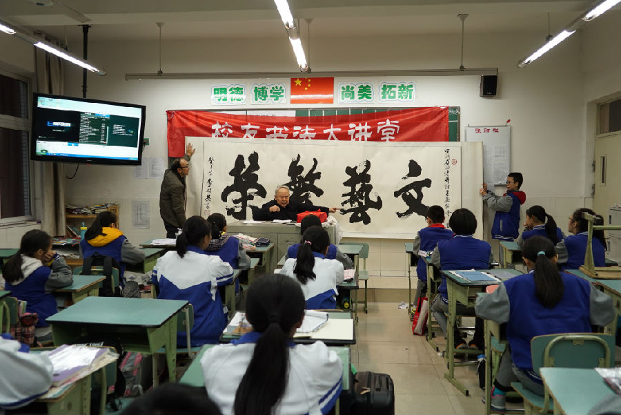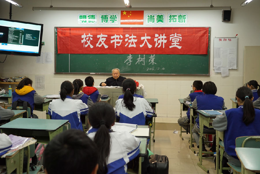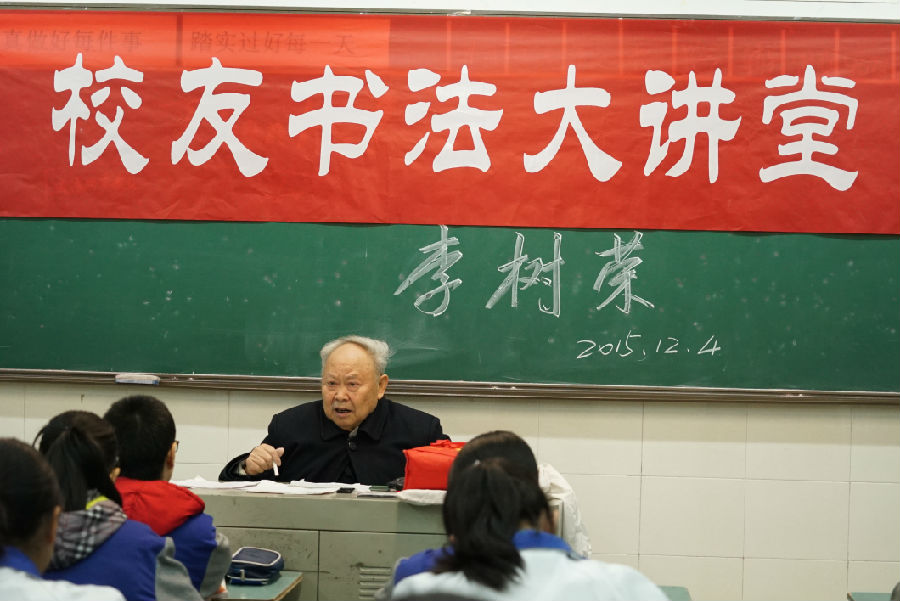 2015124星期五,为提高校队活动学生对书法的兴趣和成长、以及对书法艺术的理解,我校校队活动课时间邀请了著名书法家——已86岁高龄的李树荣先生,来校为学生作了“书法成长中的快乐与困惑”的讲座。李先生以他朴实幽默的语言,用自己的书法成长故事,让学生了解到他学习书法的艰苦过程,体会到了那时候学习的辛酸苦辣,更有收获时的快乐和幸福。更激励学生抓住现在学习的黄金时期,珍惜现在拥有的众多学习资源,提高书法技艺,为自己终身兴趣爱好而努力学习。