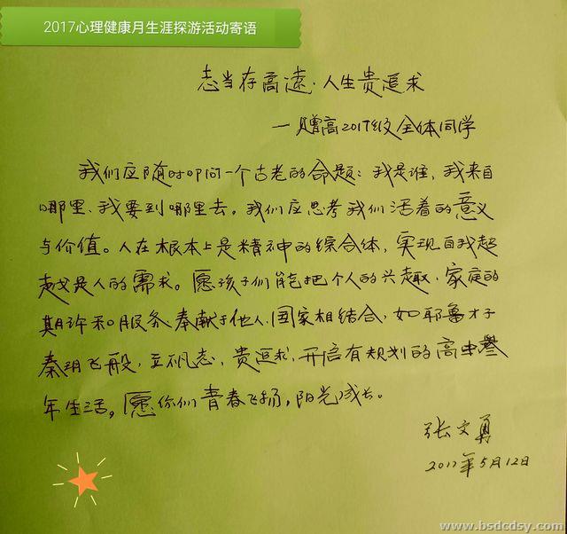 本次活动主要分4个流程。第一,知识竞答。同学们在两份答卷中任选一份进行答题,每份试卷有20道题,涵盖了多方面的心理知识,答对11道即可换得一张红卡。第二,自我探索和规划体验。自我探索就是通过测试测验自己的性格、能力、兴趣,以便同学们对自身有一个大概的了解,完成后可换取一张黄卡。规划体验就是通过霍兰德兴趣岛测试,帮助同学们洞察自己真正的个体类型,匹配自己所喜欢的职业内容,最后帮助自己把握好职业定位和方向,并换取一张绿卡。第三,约会梦想,校长寄语。各位同学集齐上述三张不同颜色的卡片后可在主席台前方换取三年前同学们自己写给未来自己的信,并获得张校长给予高2017级同学的寄语。张校长对我们全体同学寄予厚望,他希望同学们能够把个人兴趣、家庭期许和服务他人相结合,立不凡志,贵追求,开启有规划的高中生活。最后一个流程是同学们在活动感言版上留言,同学们拿到自己三年前(初中入学的一封信——写给三年后的自己)的信后感触万分,纷纷表示要不忘初心,明确目标,在通向未来的道路上继续努力。