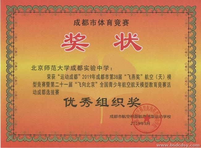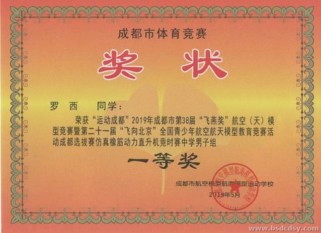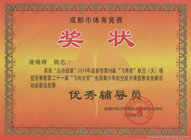 我校凌锡帮老师带领的团队在“运动成都”2019年成都市第38届“飞燕奖”航空(天)模型竞赛暨第二十一届“飞向北京"全国青少年航空航天模型教育竞赛活动成都选拔赛中,一举夺得了三个项目的五个一等奖。在“翼神”橡筋动力扑翼机竞时赛中,我校朱华飞和谢天祺两位同学分别荣获中学男子组一等奖;在仿真橡筋动力直升机竞时赛中,我校罗西同学荣获中学男子组一等奖;在“雷鸟”橡筋飞机竞时赛中,我校罗西和朱华飞两位同学分别荣获中学男子组一等奖。大赛组委会授予凌锡帮老师“优秀辅导员”称号,同时我校荣获优秀组织奖。