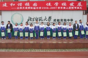 | 2007年1月29日上午,我校举行了以“建和谐校园,促学校发展”为主题的散学典礼。在散学典礼上,刘增利校长对本学期的各方面工作进行了总结,并勉励全校学生:要做一个孝敬父母的人,做一个受欢迎的人。初一年级学生进行了传统文化《弟子规》中《入则孝》一节的背诵表演,让“孝”——这个中华民族的传统美德深入每个学生的心灵,朗诵时整齐而又抑扬顿挫,节奏明朗而又不乏古人之气质,让整个校园沉浸在传统文化的氛围当中,对全校师生思想和心灵都有了极大的震动。最后对本学期各年级涌现出的三好学生、优秀学生干部、文明生、学生会团委优秀干部、文明住校生、优秀室长等进行了表彰。 | |
