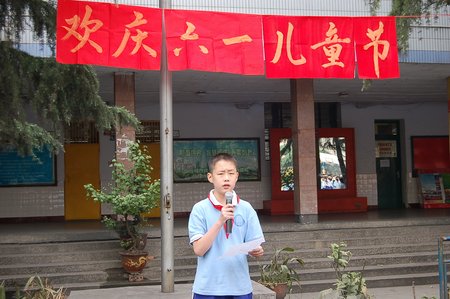 这是初2011级同学进入本校的第一个“六一”儿童节,作为他们的代表,初2011级8班的段昱谷同学做了国旗下的演讲。