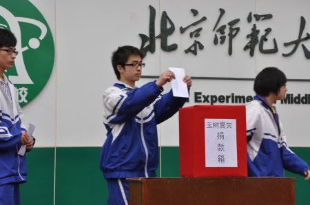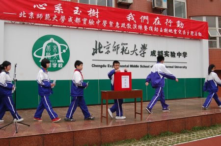 带着对青海玉树灾区人们的真诚祝福,北师大成都实验中学全校师生于4月19日上午在学校操场举行了隆重的捐助仪式。共募得现金37328.3元,