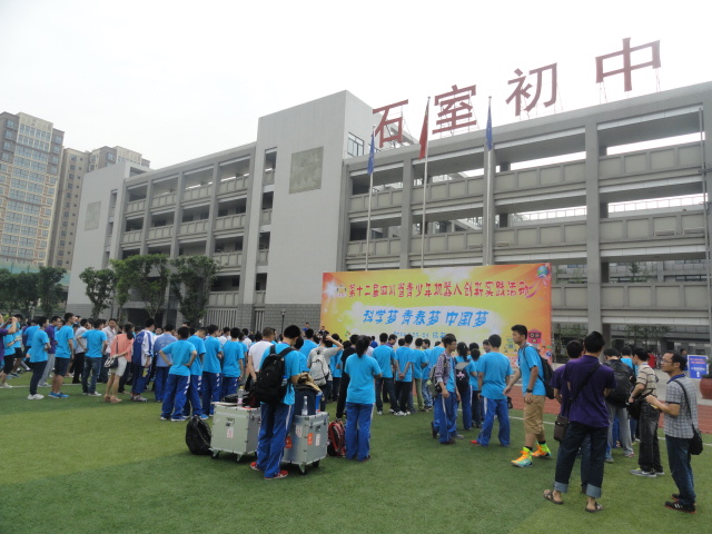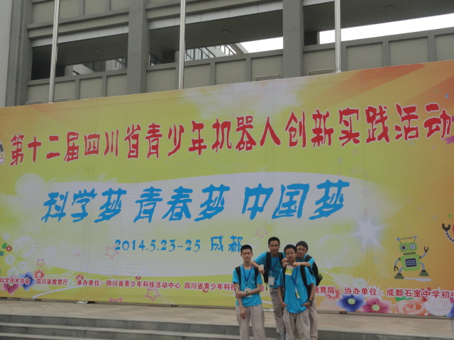 2014年5月23日,我校学生前往石室初中青龙校区,参加四川省第十二届青少年科技创新活动的机器人竞赛。参加此次活动的有来自全省的600多名同学,共130多支参赛队伍,此次活动总共有6大项目的竞赛,其中,由我校卢雪雄老师带队的初二1班姜汶良,初二10班曾俊浩,高一2班朱民剑,高一4班韩若冰同学参加了此次活动中的综合技能项目。