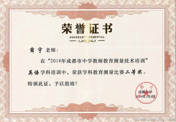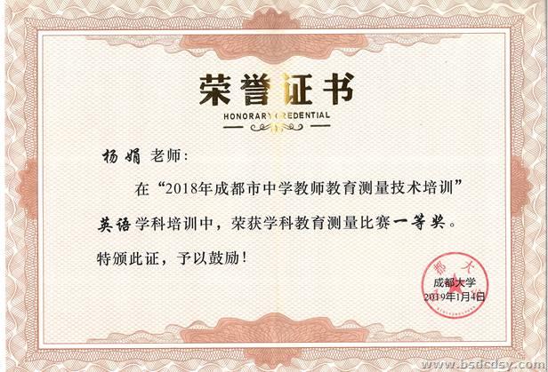 在 “2018年成都市中学教师教育测量与评价技术”英语学科培训中,我校杨娟老师荣获学科教育测量比赛一等奖,薛宇荣获学科教育测量比赛二等奖。两位老师均受到大赛主办单位成都大学的表彰。