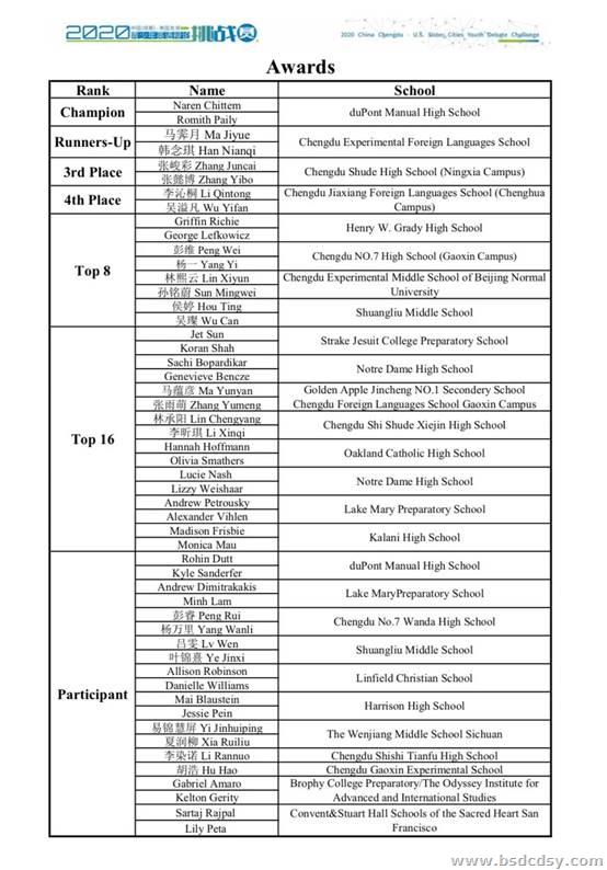 由成都市人民政府外事办公室和成都市教育局主办,美中国际教育集团承办,面向成都市和美国友好城市、友好合作关系城市、友好交流城市的高中生的2020(第四届)中国(成都)·美国友城青少年英语辩论挑战赛中美挑战赛日前圆满结束。
